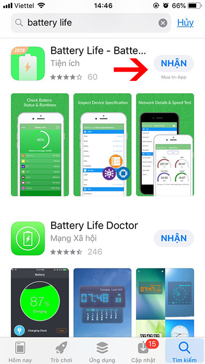 B1: Vào App Store và tìm kiếm với từ khoá Battery Life -> Chọn phần mềm có biểu tượng Pin và tia sét như hình bên dưới