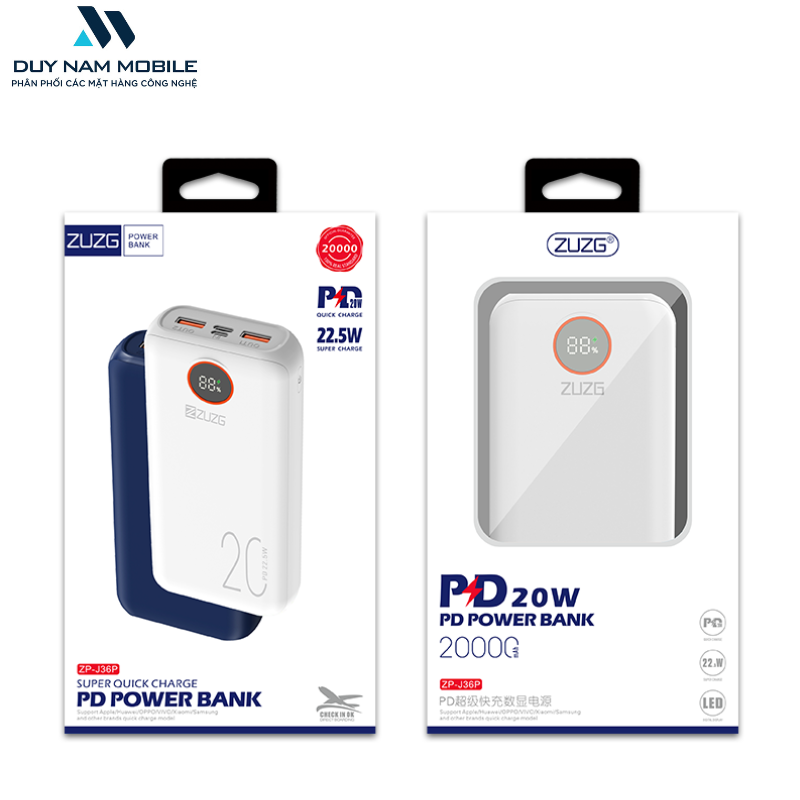 Pin sạc dự phòng 20000mAh ZUZG J36P sạc nhanh 22.5W cho Apple , Samsung , Oppo , Vivo, Huawei , Xiaomi...
